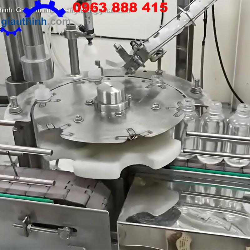 Sau khi chiết rót, chai sẽ được chuyển đến máy đóng nắp. Máy có nhiệm vụ siết chặt nắp chai, đảm bảo kín, tránh rò rỉ trong quá trình vận chuyển và sử dụng.