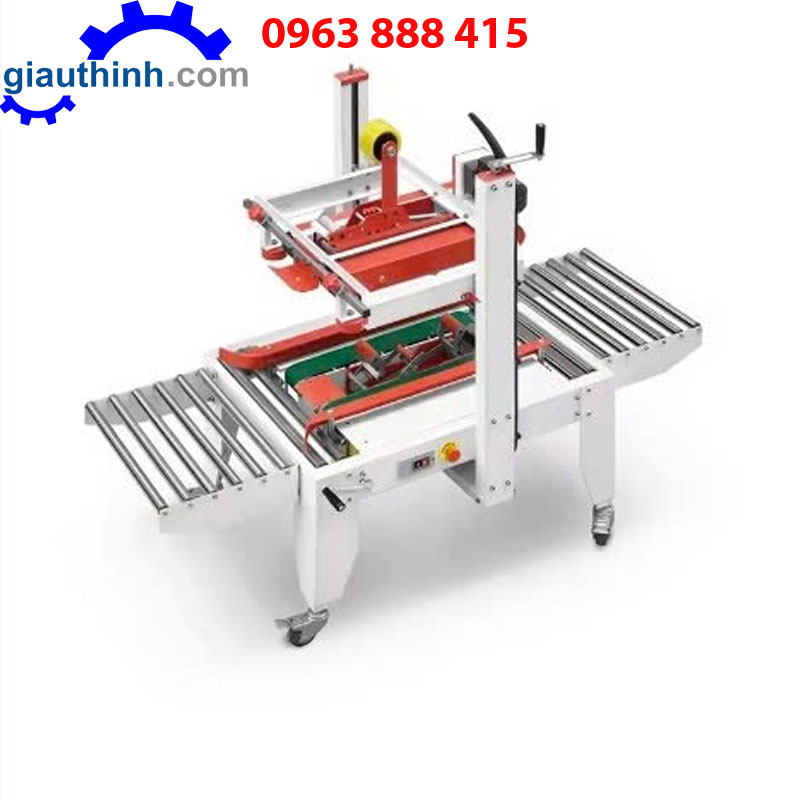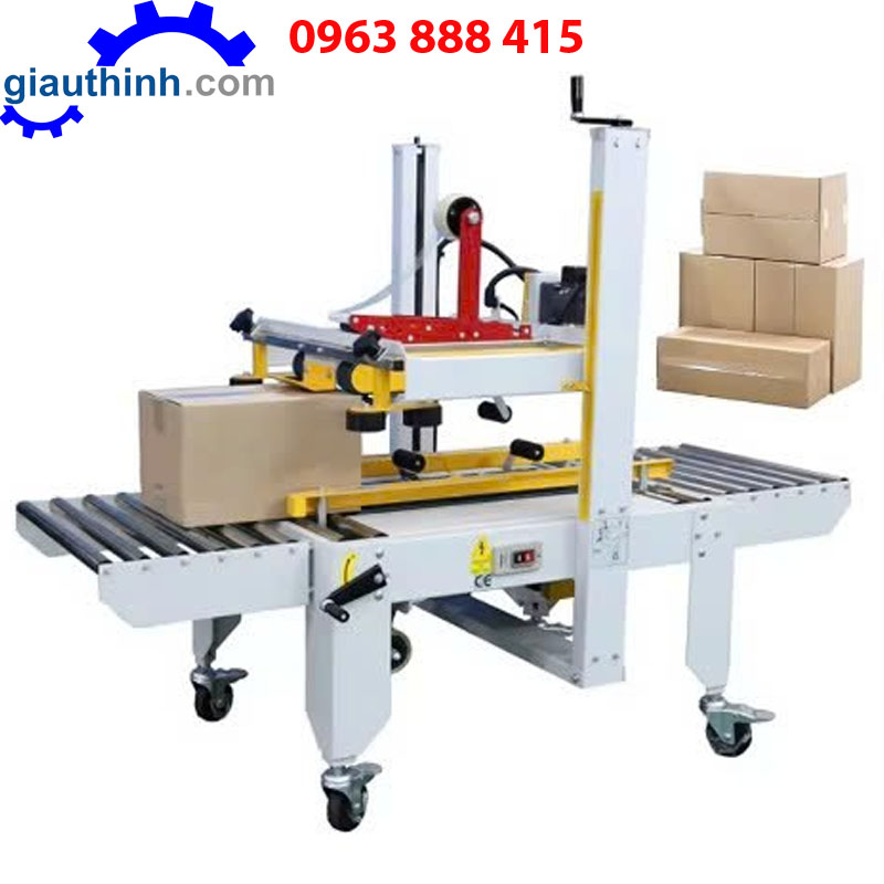 Máy dán thùng bán tự động: Nhân công đưa thùng vào, máy tự động dán băng keo.